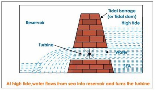 Durning high tide, when the level of water in the sea is high, sea - water flows into the resvoir of the barrage and turns the turbines. The turbines then generators to produce electricity. And during the low tide, when the level of sea- water stored in the barrage reservoir is allowed to flow out into sea.